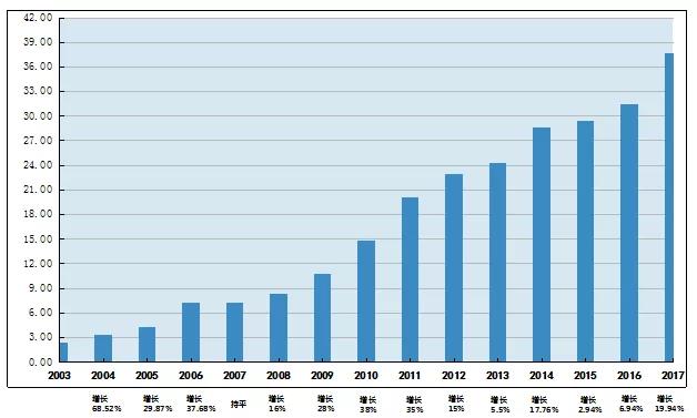 数据分析图一:《乐鱼官网页面-乐鱼online(中国) 公司2003-2017年营业额数据图》(单位:亿元)